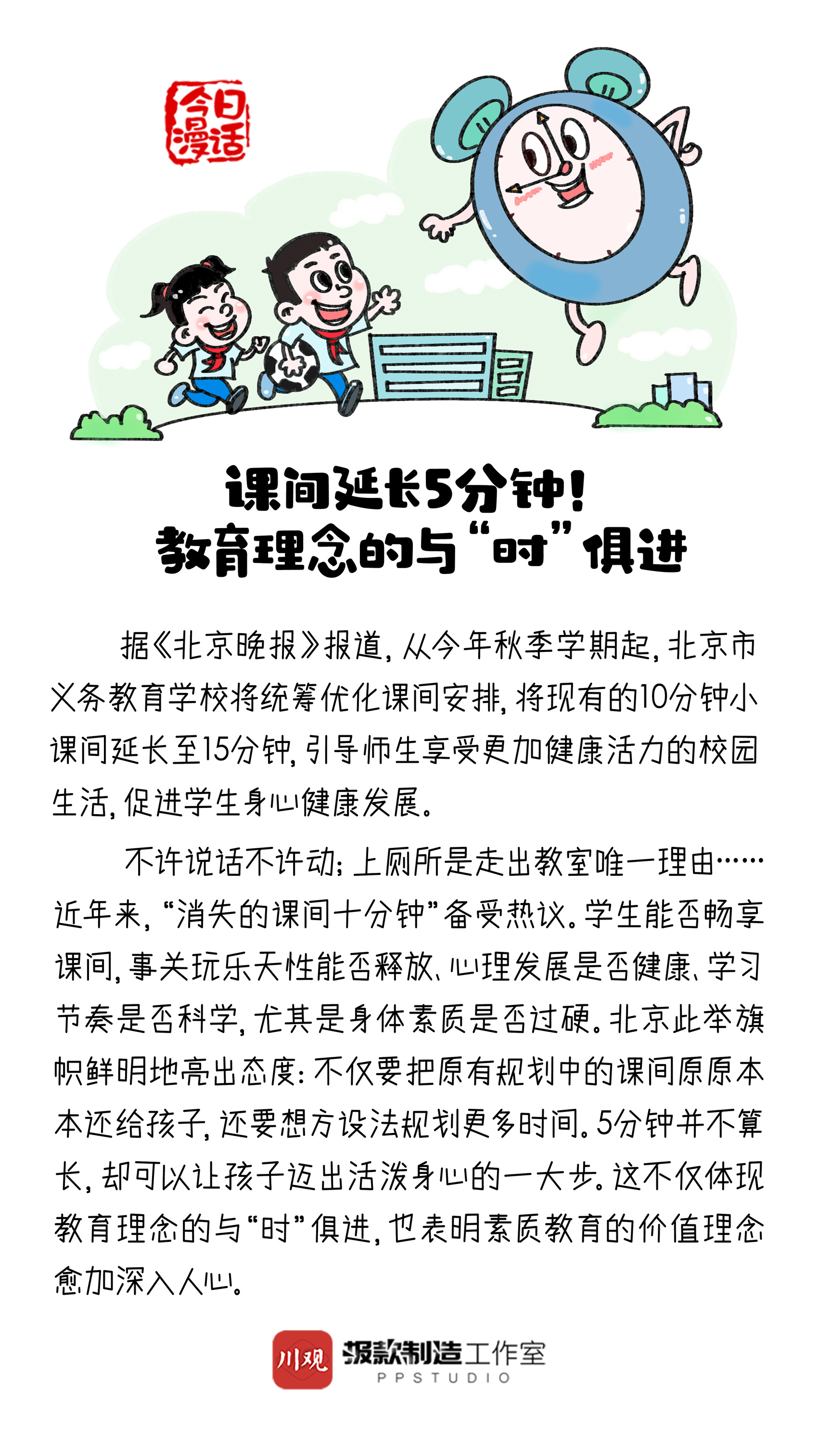 课间延长5分钟,不仅是一种时间上的扩容,更代表的是一种意识上的提醒:课间时间就应该有专门的保障,就应该被“郑重其事”对待,不容被随意挤占和剥夺。