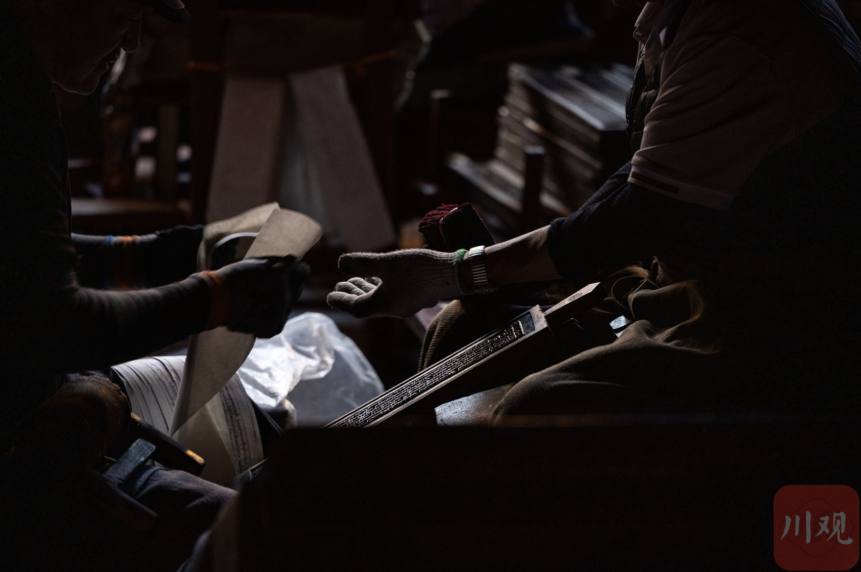 印经院工人师傅印制经书。