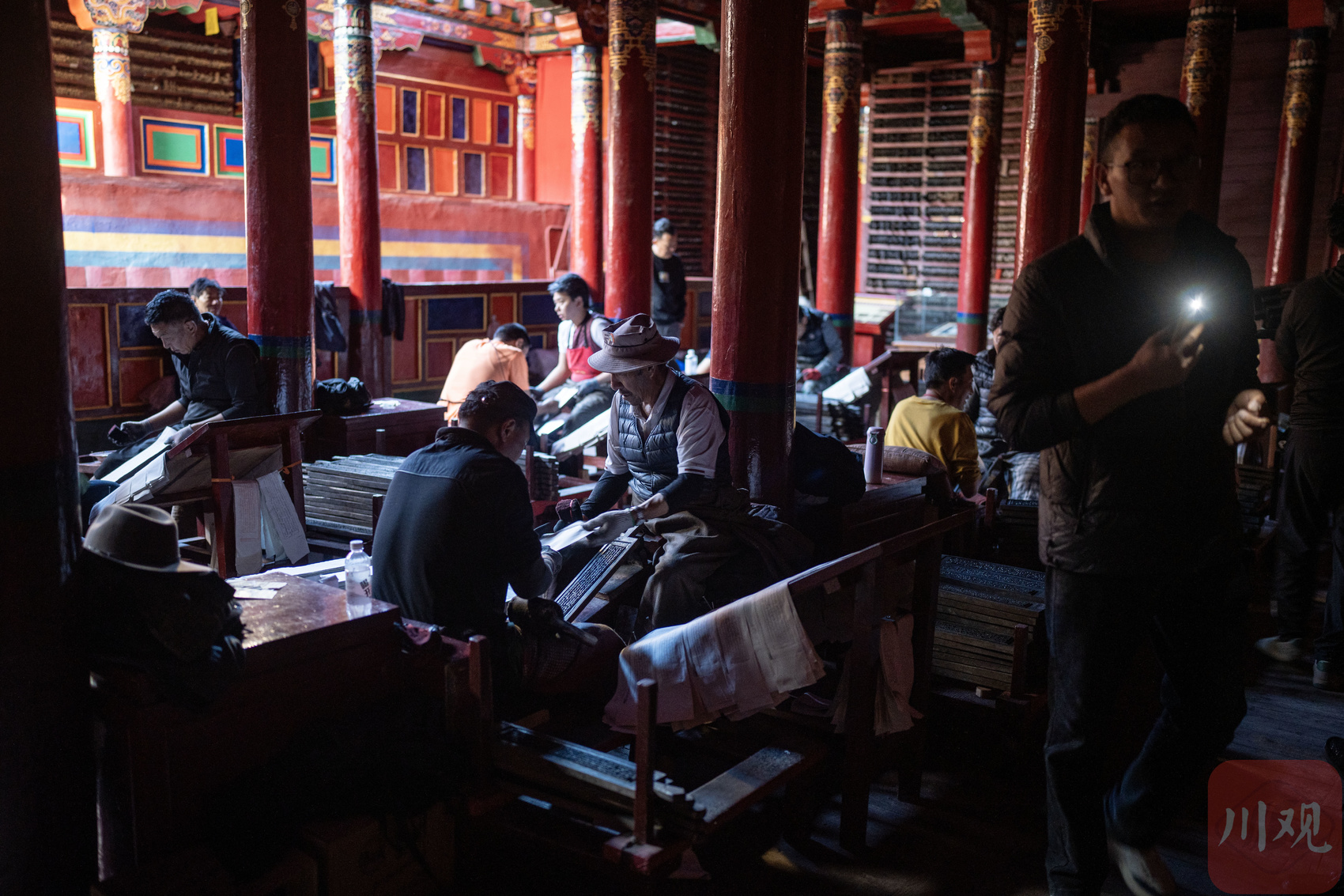 印经院工人师傅印制经书吸引了游客观看。
