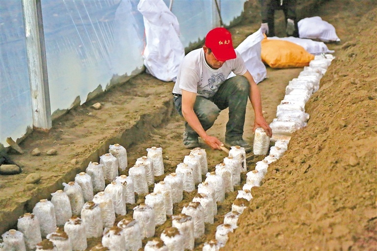 米林市米林镇红太阳家庭示范农场的工人在埋植林芝灵芝的三级菌包。记者 谢筱纯 摄