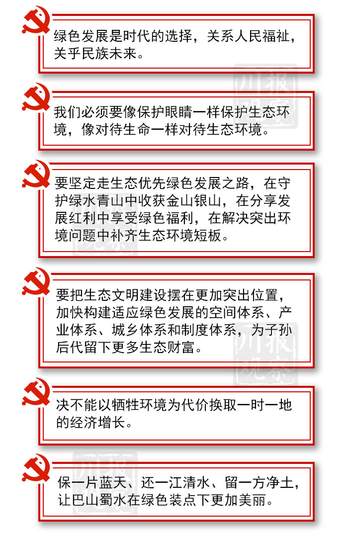 绿色发展是时代的选择,关系人民福祉,关乎民族未来。我们必须要像保护眼睛一样保护生态环境,像对待生命一样对待生态环境。要坚定走生态优先绿色发展之路,在守护绿水青山中收获金山银山,在分享发展红利中享受绿色福利,在解决突出环境问题中补齐生态环境短板。要把生态文明建设摆在更加突出位置,加快构建适应绿色发展的空间体系、产业体系、城乡体系和制度体系,为子孙后代留下更多生态财富。决不能以牺牲环境为代价换取一时一地的经济增长。保一片蓝天、还一江清水、留一方净土,让巴山蜀水在绿色装点下更加美丽。