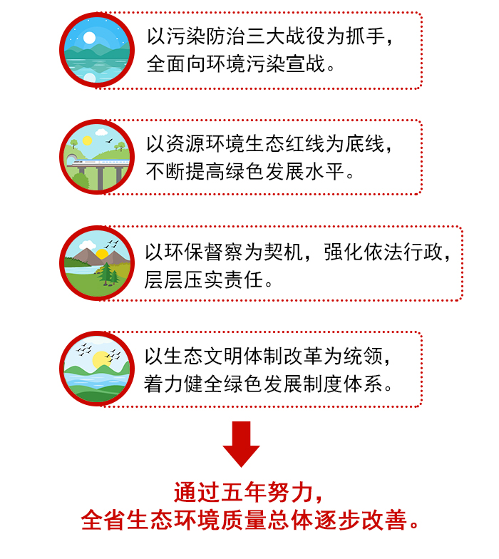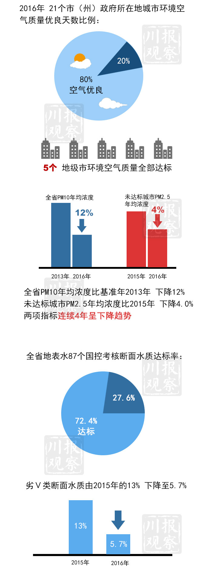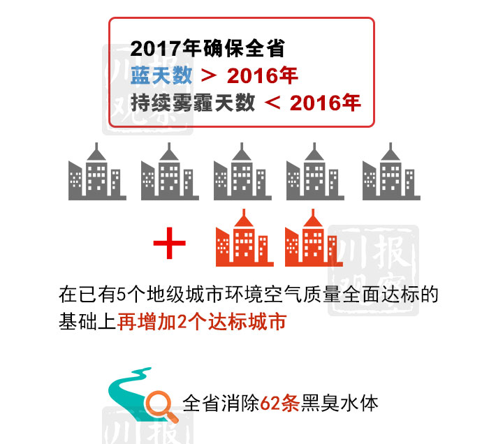 确保全省蓝天数多于去年,持续雾霾天数少于去年,在已有5个地级城市环境空气质量全面达标的基础上再增加2个达标城市。全省消除62条黑臭水体,成都市主城区全部消除黑臭水体,3-5个条件较好的市(州)实现城区内全部消除黑臭水体;21个市(州)政府所在地的41个集中式饮用水水源地水质百分之百达标。