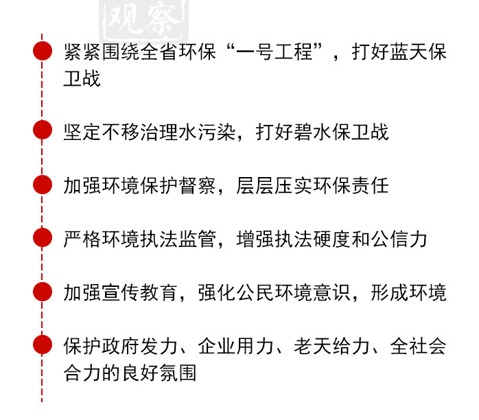 加强环境保护督察,层层压实环保责任。2016年以来开展的省内环保督察,充分体现了省委省政府加强环境保护推进绿色发展的坚定决心和勇气。环保督察只能持续加压加码,不能半点松劲,必须倒逼一批事关人民群众切身利益的久拖不决的突出环境问题整改到位。重点采取六项举措:一是公示公开。按照要求,督促各市(州)向社会公开环保督察报告、环保督察整改方案,并限期完成整改任务,主动接受社会公众监督。二是挂牌督办。针对重点问题整改不力、重点区域问题突出、重点县区“降温回潮”苗头,实行挂牌督办,对问题死盯不放督促解决。三是公开约谈。对未落实“党政同责、一岗双责”、环境质量不升反降、未完成年度环保目标任务的地区,对其党委政府主要负责人及相关部门负责人实施约谈。四是媒体曝光。借助和发挥新闻媒体的作用,宣传报道市县、企业在环保方面做得好的先进典型,批评曝光违法违规的反面案例,通过正面引导、反面督导,督促问题整改,用舆论手段为环境保护鼓与呼。五是移送追责。追责不是目的,整改才是关键。对发现的党委政府、相关部门和企事业单位涉嫌违反环保法律法规和相关规定的线索,通过责任追究,倒逼工作落实。六是区域限批。对个别地区环境问题突出、执法明显偏软且环境质量不升反降的,将抓典型、区域限批,迫使有关政府进一步堵住增量,消化存量,优化结构,改善质量。