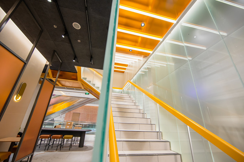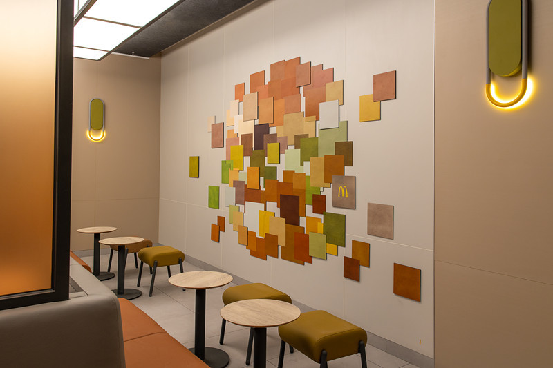 有趣的是,餐厅以大小方盒为设计元素,拼砌成抽象的巨无霸等麦当劳经典美味,简约时尚且充满趣味。立体的空间內,半透明旋转的黄色楼梯以及带有金色拱门线条的餐桌座椅更首次出现在麦当劳餐厅。