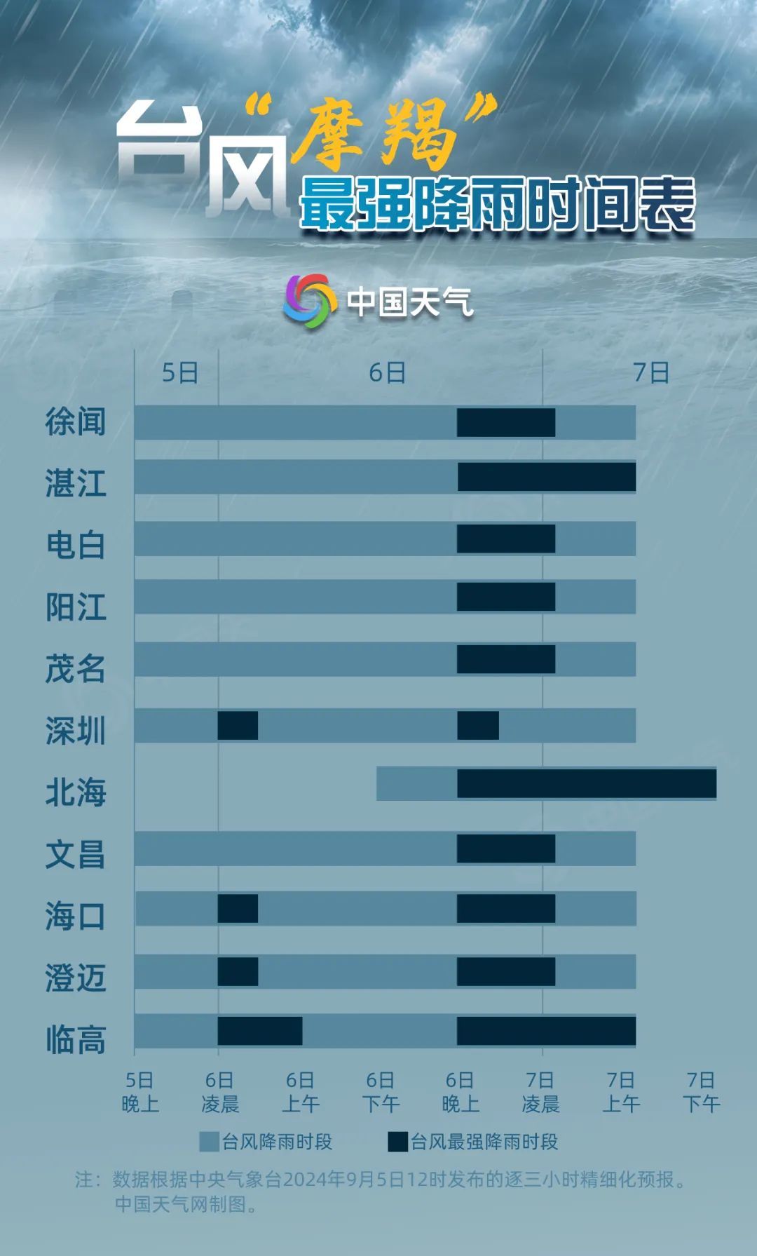 从中国天气网推出的台风“摩羯”最强降雨时间表来看,今夜至后天,强降雨区域将逐渐铺展,广东、海南、广西等地多地将陆续开启最强降雨时段。深圳、海口、澄迈、临高将在6日凌晨进入最强降雨时段,需警惕暴雨或大暴雨;徐闻、湛江、电白、阳江、茂名等地也将在6日夜间前后陆续迎来最强降雨。
