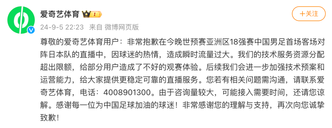 5日22时许,@爱奇艺体育 就此事致歉,表示因球迷的热情,造成瞬时流量过大,该平台技术服务资源分配超出限额,给部分用户造成了不好的观赛体验。但未提及向未能观看直播的用户退款等内容。