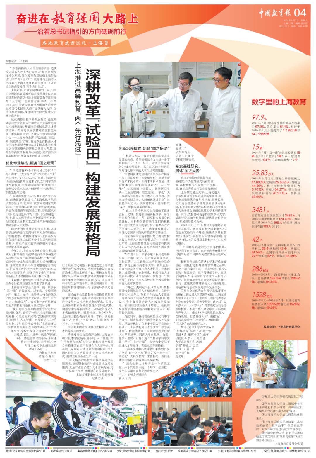 优化调整高校学科专业布局,强化基础学科拔尖创新人才和重点产业紧缺急需人才培养改革,开展特定领域急需人才精准培养,布局建设高校基础研究新型高地,聚焦国家重大任务建设市级协同创新中心……上海充分发挥“开路先锋、示范引领、突破攻坚”作用,着力以全面提高人才自主培养质量为根本,以支撑高水平科技自立自强和服务经济社会发展为两翼,提升全市高校的服务力、贡献度,更好担当国家战略使命,更好服务教育强国建设。