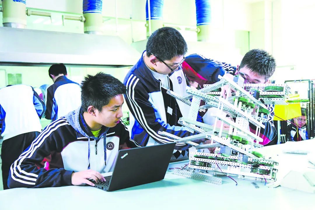 华东师范大学第二附属中学学生正在进行机器人搭建,并将通过自主编写的程序让机器人运行起来。