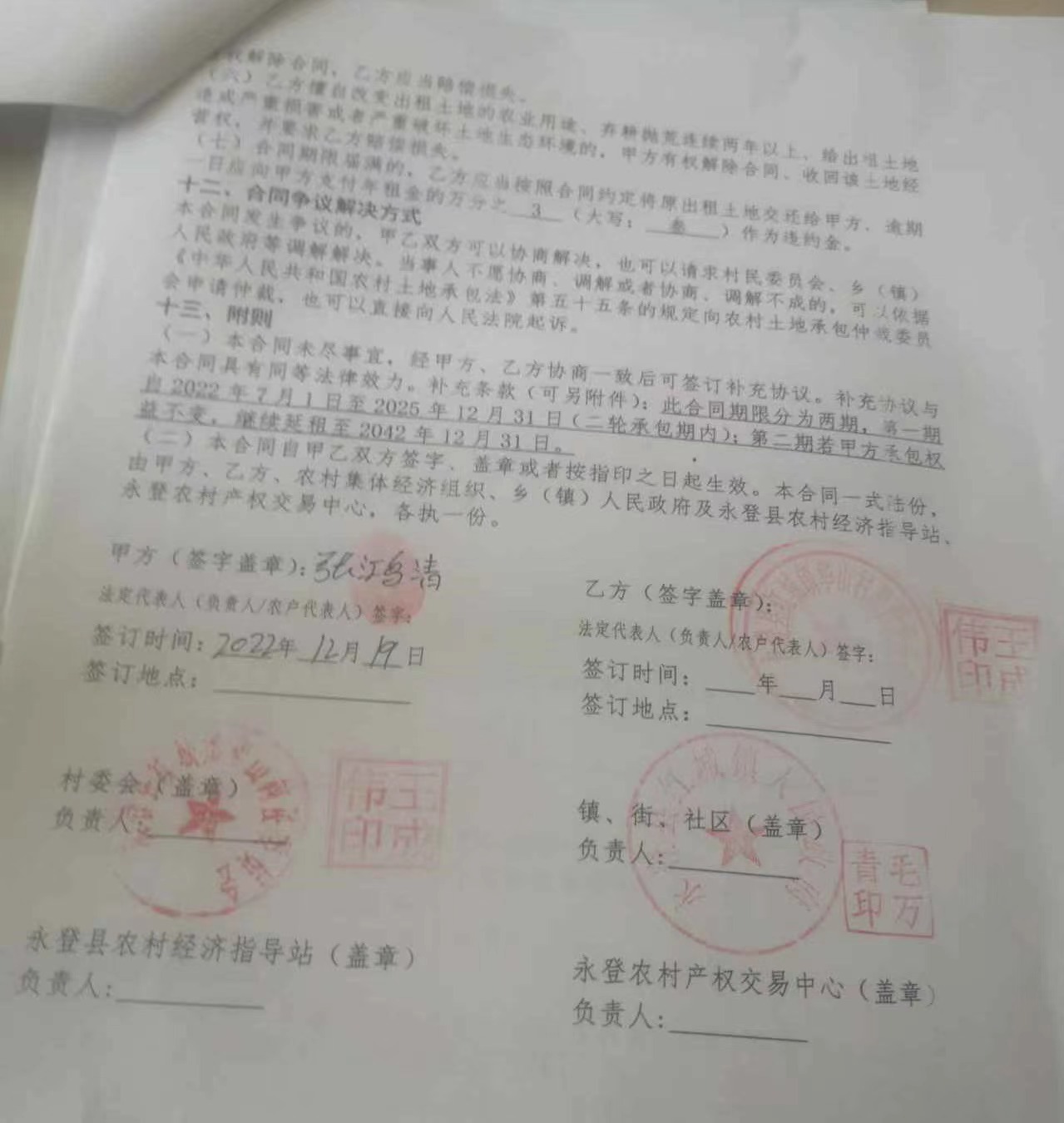 该合同落款时间为2022年12月19日,除有签有张鸿清名字外,还盖有乙方华山村股份经济合作社公章、华山村村委会公章、红城镇政府公章及相关负责人私章。但合同上永登县农村经济指导站、永登县农村产权交易中心盖章处均为空白。
