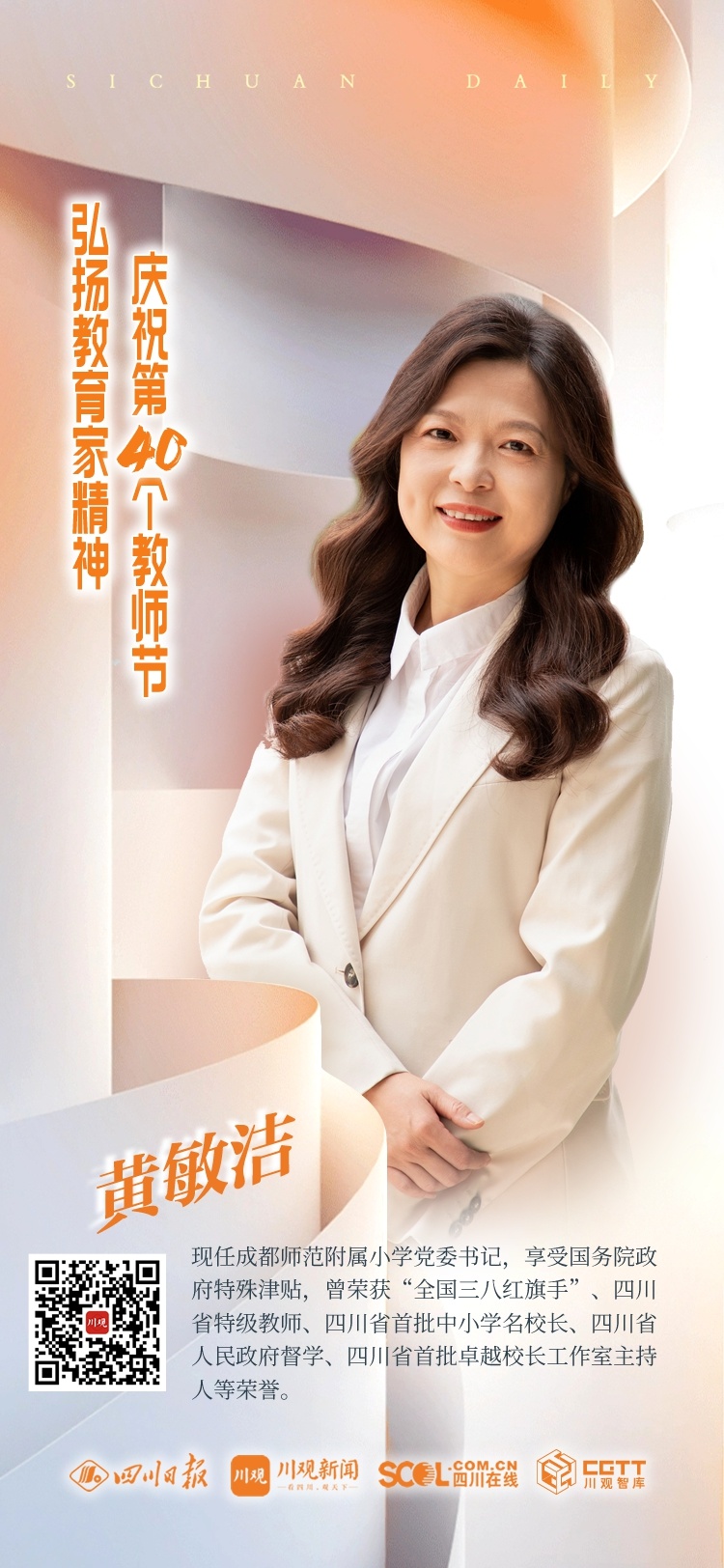 黄敏洁,现任成都师范附属小学党委书记,享受国务院政府特殊津贴,曾荣获“全国三八红旗手”、四川省特级教师、四川省首批中小学名校长、四川省人民政府督学、四川省首批卓越校长工作室主持人等荣誉。