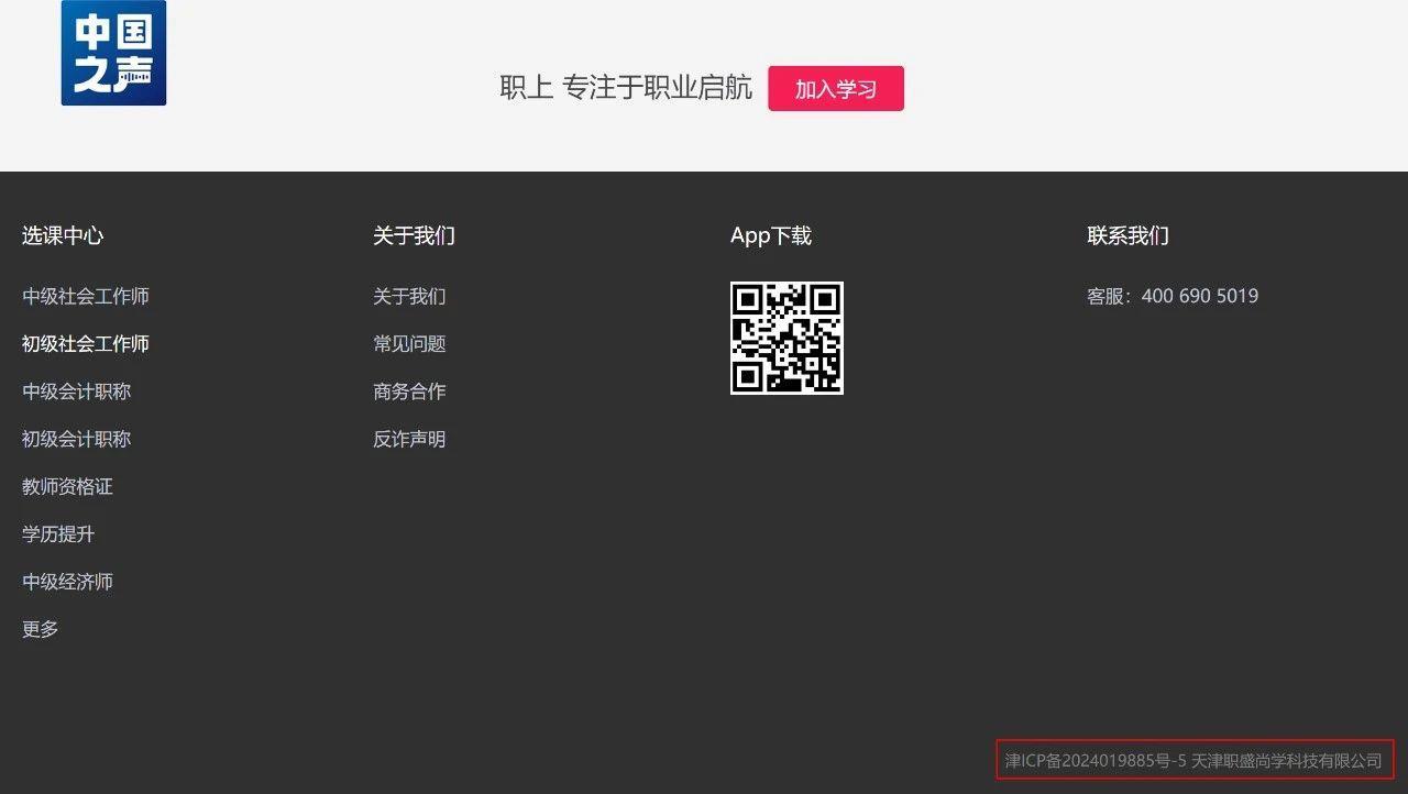 记者关注到,“职上网”首页底部的网站备案信息处,显示“天津职盛尚学科技有限公司”字样,与“职上”APP内能查看到的营业执照显示的公司一致。而进入“职上网”的“商务合作”页面,页面底部却标识为“北京职尚教育科技有限公司”。