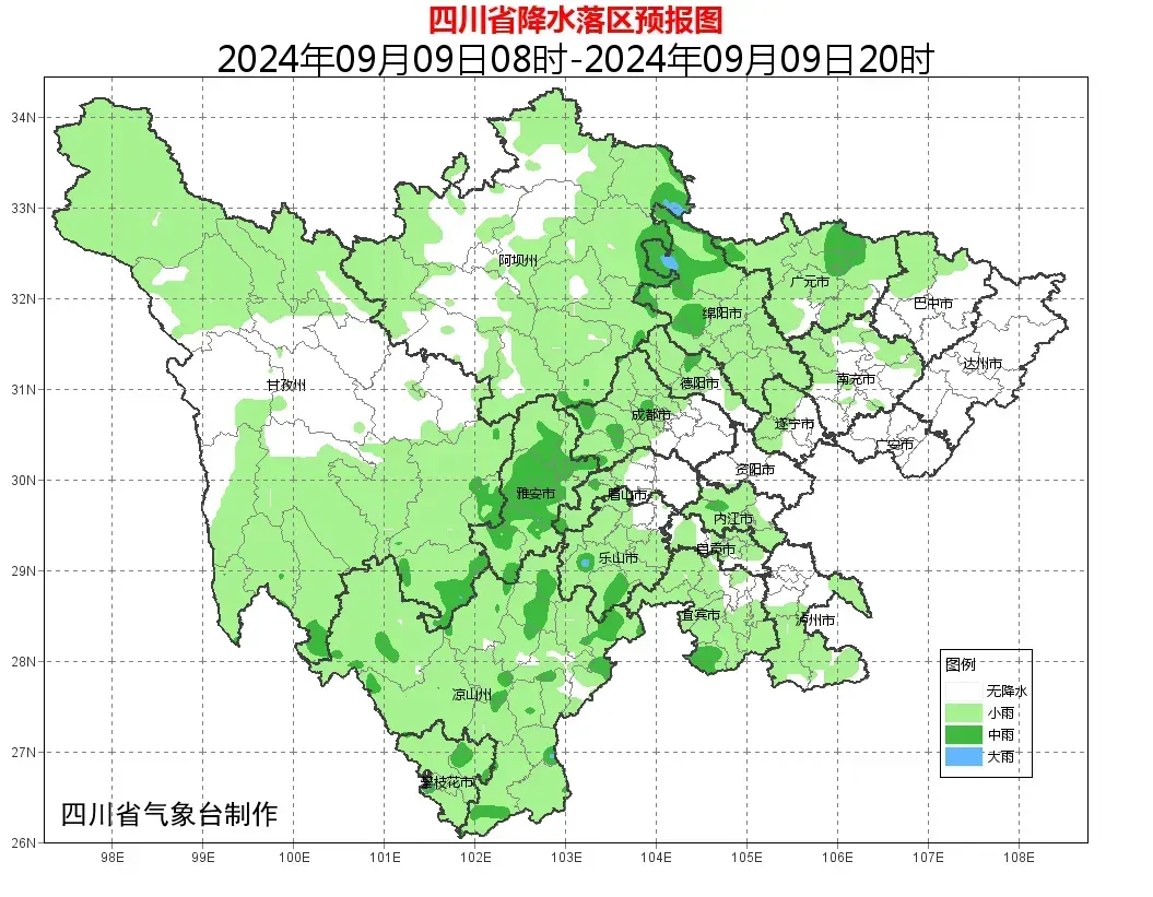 9月8日晚上到9日白天:盆地以多云天气为主,部分地方有阵雨或雷雨,其中广元、绵阳、德阳、成都、雅安、乐山、眉山7市有中雨到大雨,局地暴雨;川西高原和攀西地区多云间阴有阵雨或雷雨,局部中到大雨。