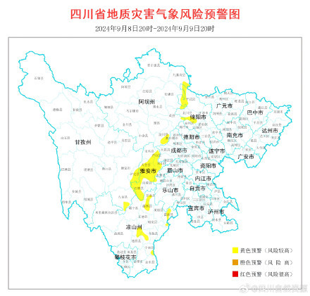 根据四川省气象台天气预报情况,结合四川省地质环境条件,9月8日20时至9月9日20时,全省地质灾害气象风险预警结果如下: