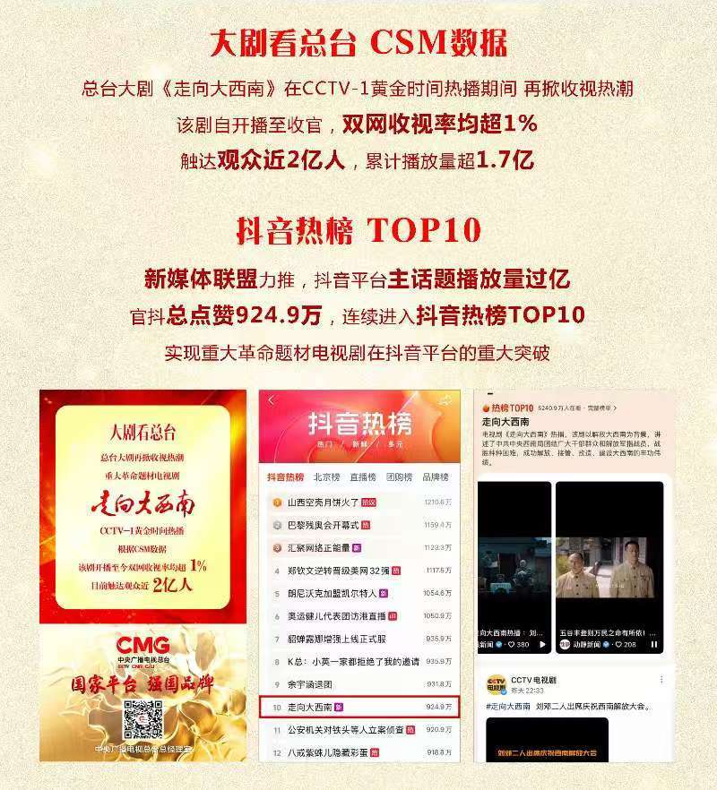 据悉,该剧从剧本创作至拍摄完成历时四年,剧情涉及土地改革、经济改制、成渝铁路建设等内容,多维度、多层次、多角度展现邓小平同志在大西南建设中的前瞻性和开拓性成就。凭借生动鲜活的人物形象、虚实结合的创作手法,以史为据的多维度视角,《走向大西南》在播出期间再掀收视热潮,创造了近年来重大革命题材电视剧收视率的新高。