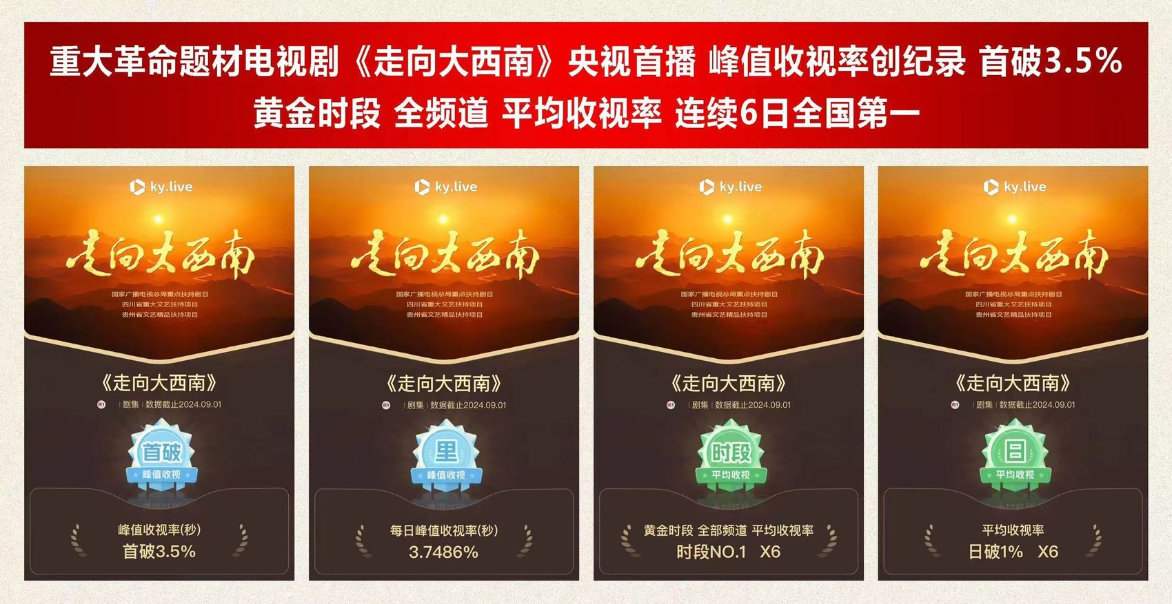 据国家广电总局节目收视综合评价数据系统显示,《走向大西南》开播当晚就成为黄金时段电视剧的收视率冠军。播出期间,该剧黄金时段全频道的平均收视率连续9日位居全国第一,单集峰值收视率创纪录首破3.5%,平均收视率2.76 %,实现热度和口碑的双重登顶。自开播至收官,双网收视率均超1%,触及观众近2亿人,累计播放量超1.7亿,创造了近年来重大革命题材的收视新高。