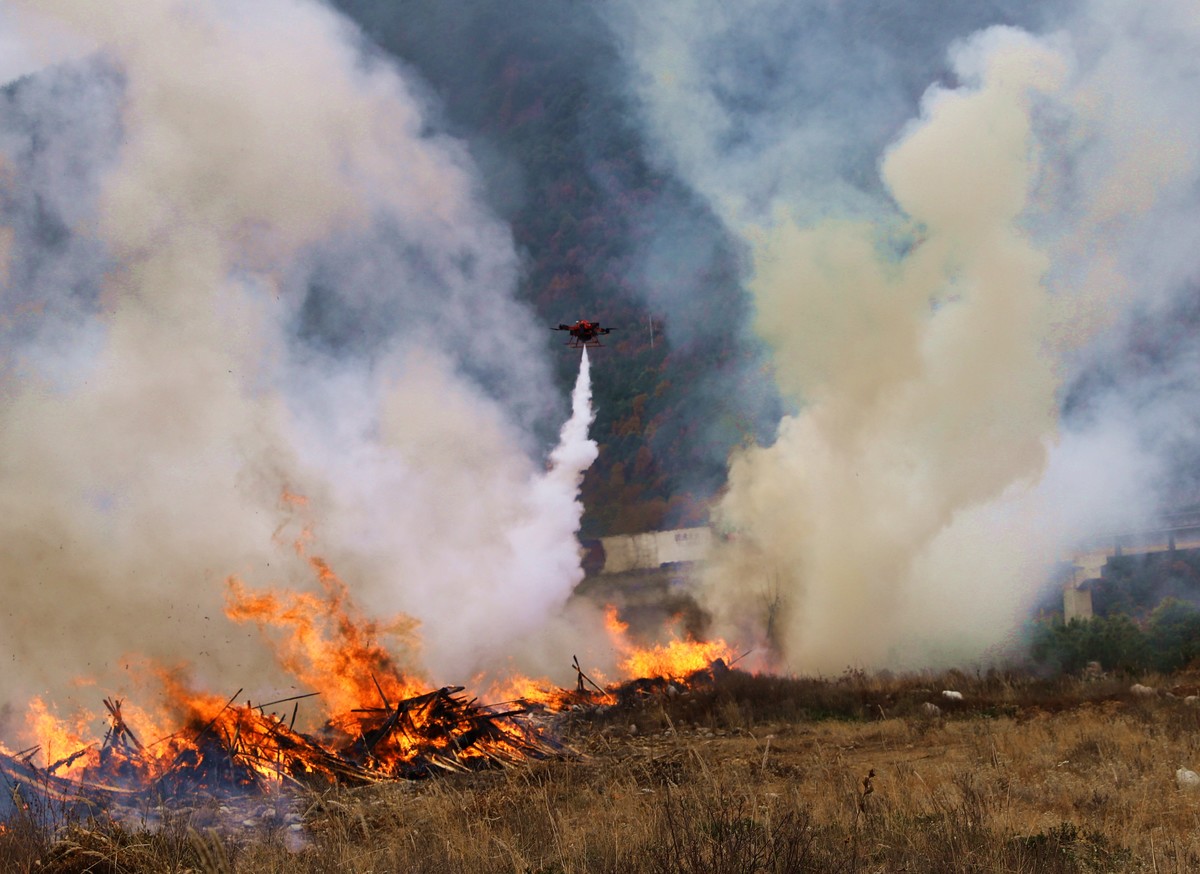 灭火装备主要展示专项整治以来各参演队伍的常规灭火机具和部分新技术装备。省森林消防总队应用和展示了工业消防无人机、全地形应急供水灭火车、森林消防供水系统、无人机指挥车、应急指挥车、应急通信车、越野加油车等一批森林灭火新特装备。以工业消防无人机为例,该无人机除了可以担负火场勘察检测任务外,还可以负载40公斤的干粉和B类泡沫,可以用于扑救悬崖及队员难以到达的地域的火灾。全地形应急供水灭火车负载一台大功率水泵和四个出水阀口,同时供四台水泵接力,可以在各种崎岖地形和狭窄路段行驶,大大提升了队伍负重转移能力,在演练中效果明显。