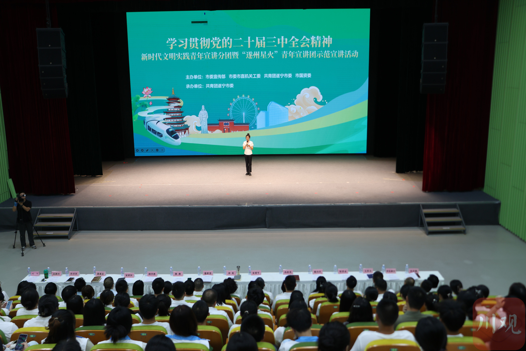 “青年朋友们,是不是加上节奏旋律,咱们的诗词也变得生动活泼了起来。保护和弘扬中华优秀传统文化,要引导全民参与,凝聚共同合力。”9月10日,遂宁市开展新时代文明实践青年宣讲分团暨“遂州星火”青年宣讲团示范宣讲活动,现场7名青年宣讲员结合自身经历,以鲜活的典型、生动的故事、活泼的语言,从弘扬中华优秀传统文化、赋能新质生产力发展、争做城乡融合乡村振兴新农人等为小切口讲述自己的所思所悟。