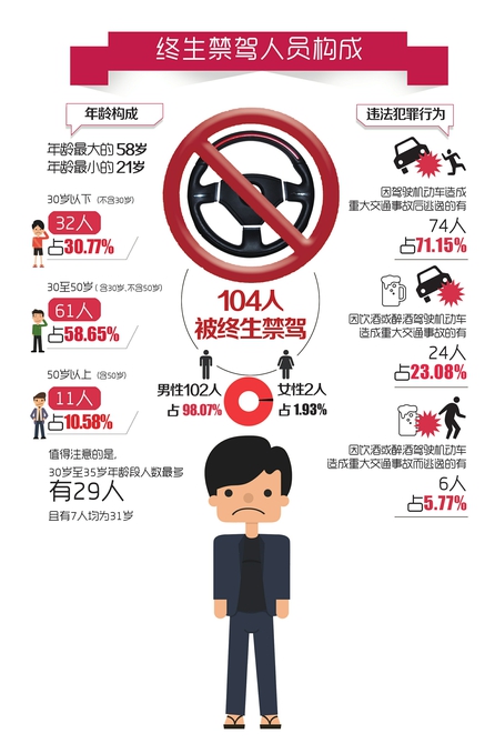 7月9日,成都交警向社会公布2016年10月至2017年6月,全市第三批“终生禁驾”机动车驾驶人名单,104人被终生禁驾。其中,超九成为男性,女性仅有2人,近三成禁驾者年龄在30岁左右。本次禁驾司机的主要违法犯罪行为,包括酒后肇事及肇事逃逸,而肇事逃逸则占了七成以上。
