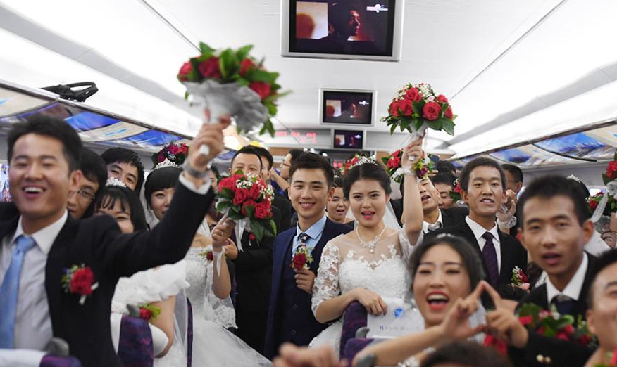 当天,在宝兰高铁首趟G2028次列车上,来自兰州铁路局及铁路建设者、铁路公安等单位的百对“铁路新人”举行了集体婚礼,开启了高铁蜜月之旅。