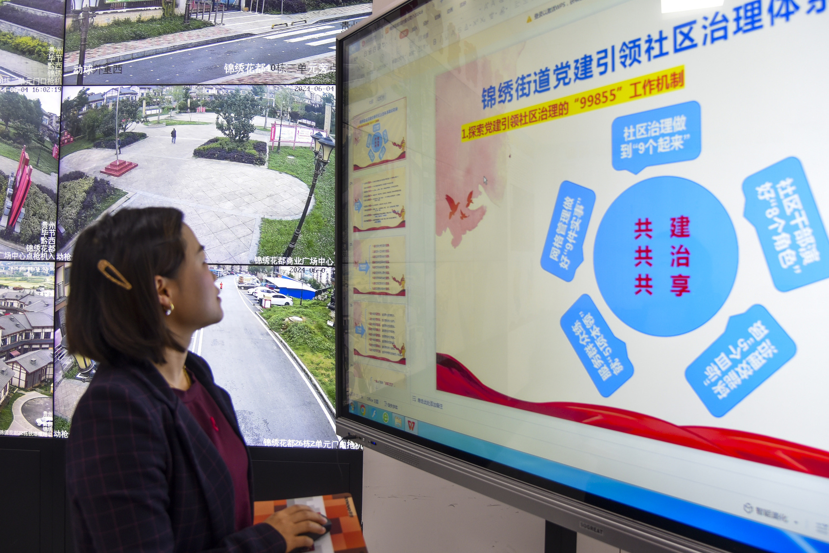 贵州毕节,在黔西市锦绣街道锦绣社区数字治理中心,管理员通过5G智慧平台实时监控、抓取和分析社区治理信息。