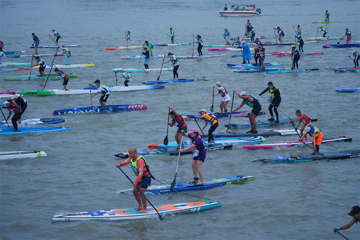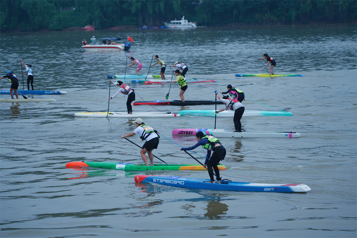 上午8时30分,随着发令枪响,一艘艘桨板如离弦之箭般飞驰而出,虽然天空飘着雨,但丝毫没影响到选手们奋力挥桨,一同劈波斩浪,在青山绿水间上演“速度与激情”。现场观众的加油声、欢呼声也是此起彼伏,氛围热烈活跃。
