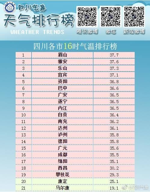 今天的冠军竞争更是激烈。下午14时,资阳以36.3度占据第一位置。好景不长,15时,昨天的状元雅安后来居上,成绩为37.1度,眉山资阳紧追其后。果然高出不胜寒,16时,眉山以0.1度微弱优势,击败雅安,霸占第一宝座。各地阳光毫无下班的架势,未来一个小时谁会位居榜首?大家快来高温竞猜吧!