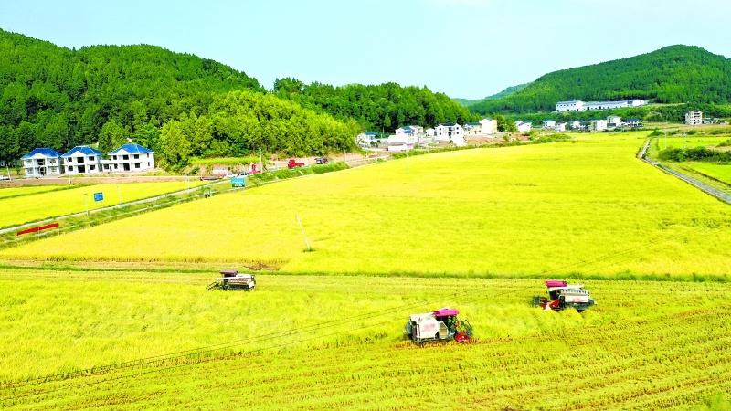 蚕子山村高标准农田里,收割机正在抢收水稻。