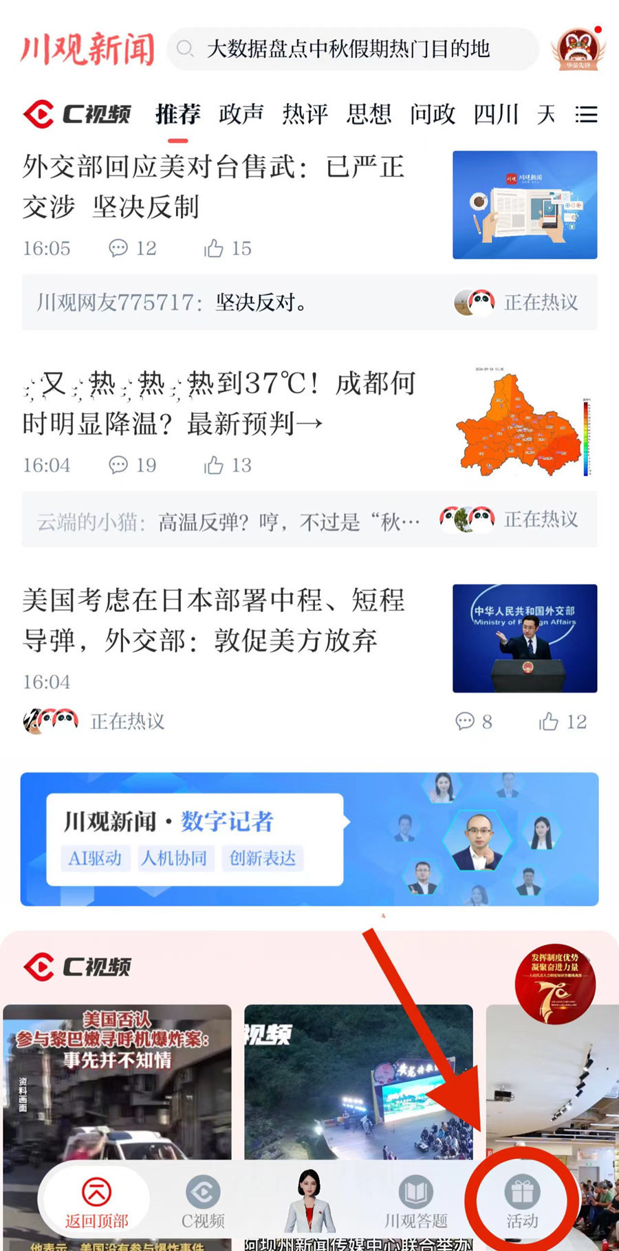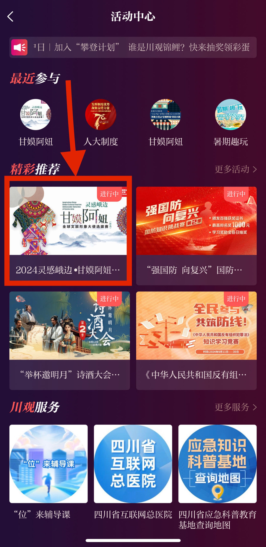 第二步:在川观新闻首页,点击“活动”,找到2024灵感峨边·甘嫫阿妞全球文旅形象大使选拔赛活动图片,点击即可参与投票。