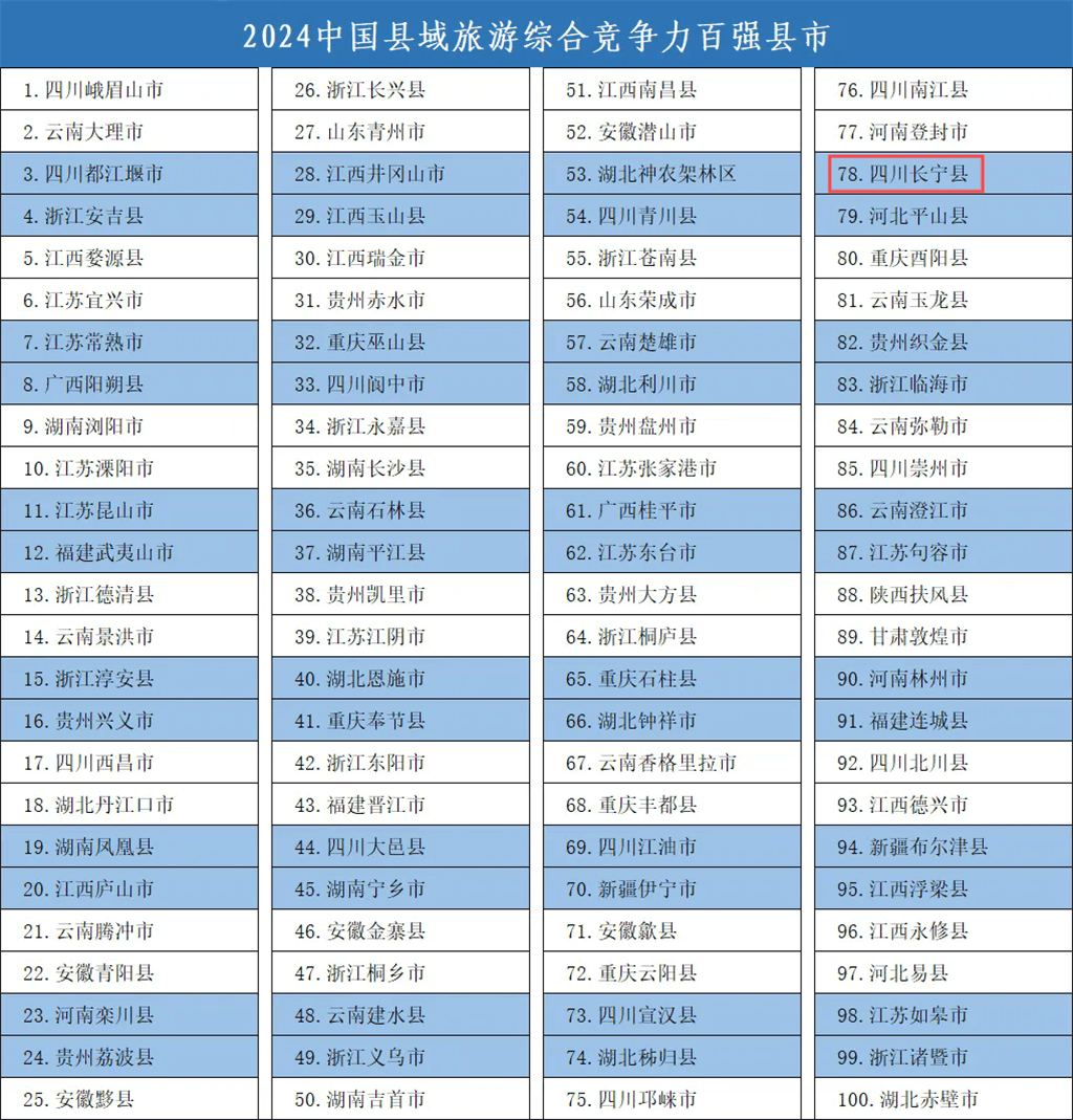 《报告》显示,2024中国旅游百强县分布在18个省(自治区、直辖市),其中四川13个,数量位居各省份之首,长宁县位列2024中国旅游百强县78位,较去年全国第91位上升了13位。长宁县隶属四川省宜宾市,地处川黔渝生态旅游金三角腹地,距宜宾市46公里,是通往滇黔的要道。长宁县境内山清水秀、旅游资源丰富,拥有5个4A、5个3A景区和1个国家级旅游度假区,是四川首批天府旅游名县,享有“中国竹子之乡”“中国十佳生态旅游名县”等美誉。