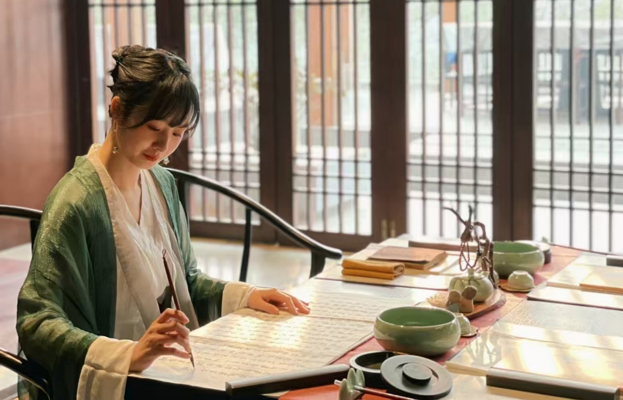 年轻游客穿汉服住国宾馆,体验书法等传统文化。供图:峨眉山红珠山宾馆