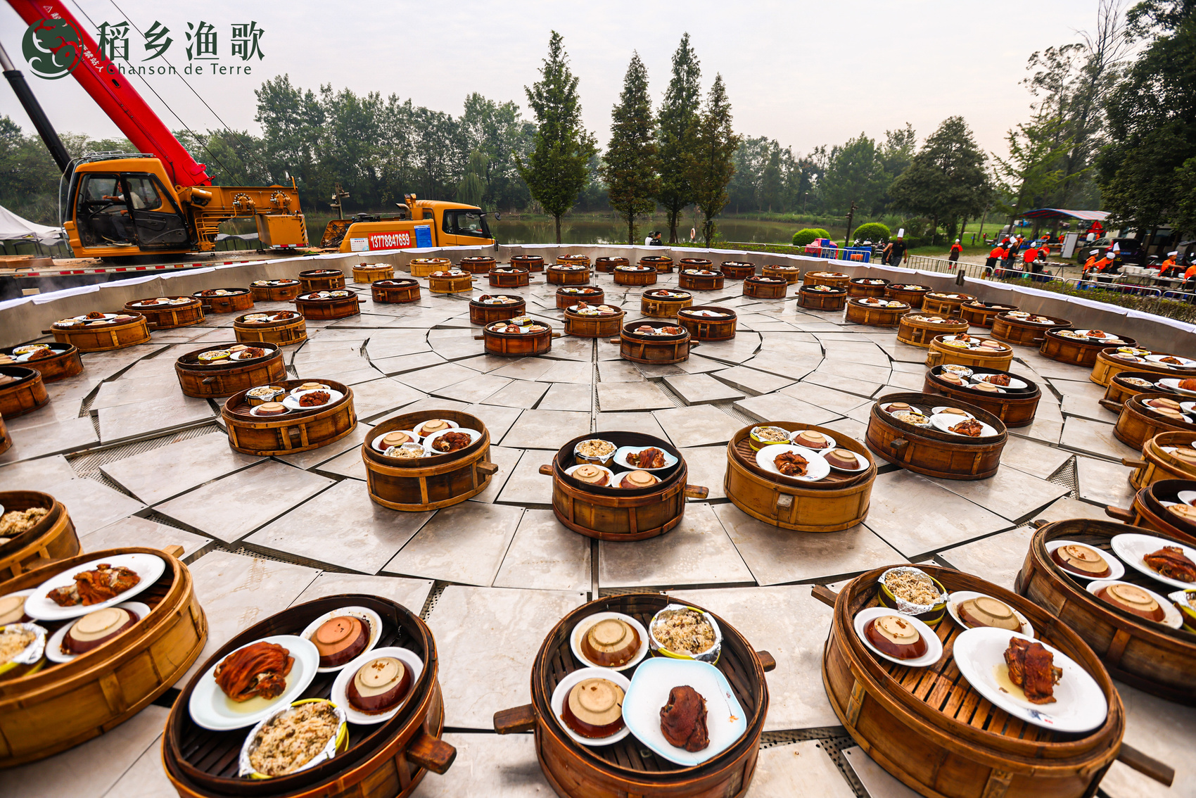 推介活动后,现场拉开了欢乐序幕——“天府第一蒸”上新开笼,菜品摆满近200米的长桌。“天府一锅蒸”蒸笼直径11.11米,高6.15米,笼屉由1234片楠竹片拼接而成,蒸出的菜品可供上千人食用。“今年的蒸笼餐比去年又升级了很多,不仅有传统蒸食,还增加了‘药食同源’主题菜品。”游客张胜感慨。9月21至22日,稻乡渔歌还将举行万人产业大闯关活动。