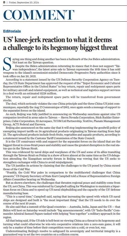原文标题:US' knee-jerk reaction to what it deems a challenge to its hegemony biggest threat