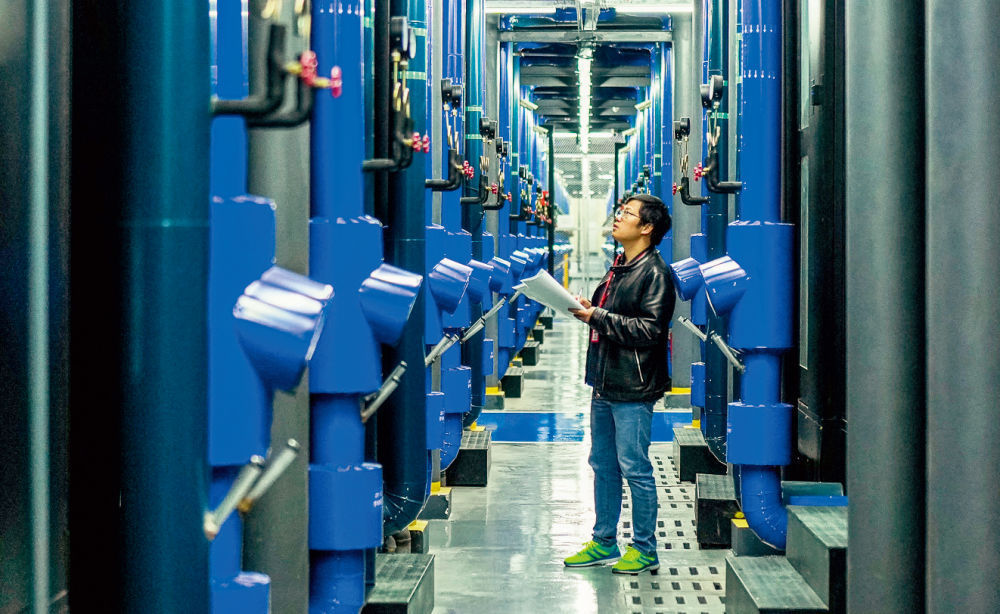工作人员在中国联通贵安数据中心对微模块机房运行状态进行巡检(2023年5月23日摄)