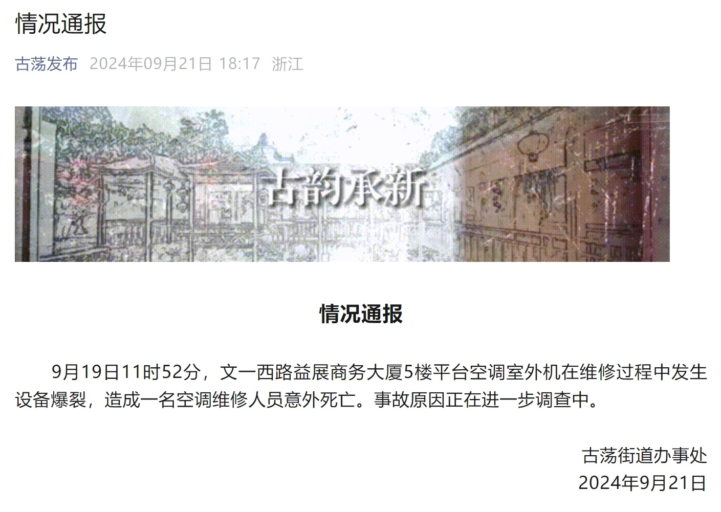 9月21日,浙江省杭州市西湖区古荡街道办事处发布通报: