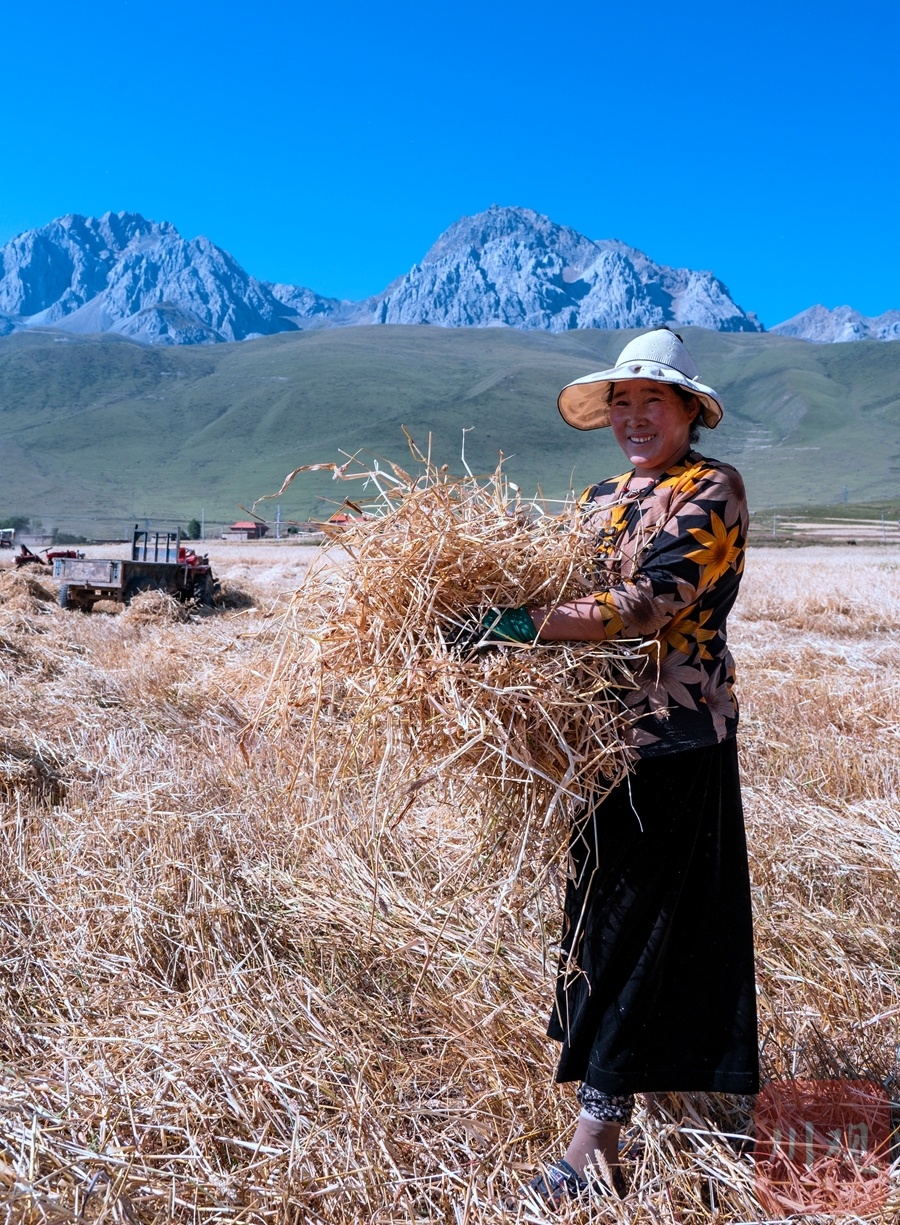 8月25日,甘孜州甘孜县仁果乡有机青稞基地,联合收割机完成收割后,德西青措将青稞秸秆打捆。今年她家的青稞再次增产。