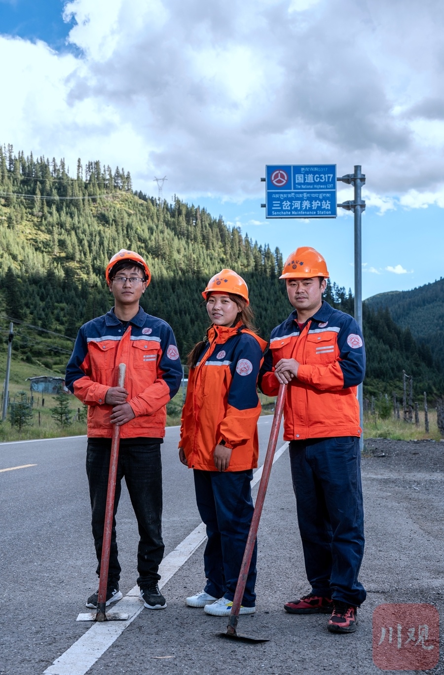 8月19日,甘孜州炉霍县炉霍公路分局三岔河养护管理站,“90后”养护员袁明建(左)、尼马翁姆(中)、兰勋常年驻守,保障国道317线的畅通。