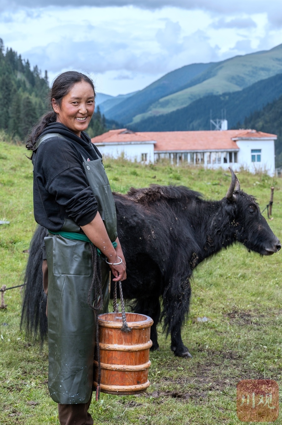 8月17日,阿坝州金川县毛日乡毛日村,村民蒲尔巴拉姆在牧场采集牦牛奶。采集的鲜奶会及时送至牛奶加工厂,为家里增加一笔可观的收入。
