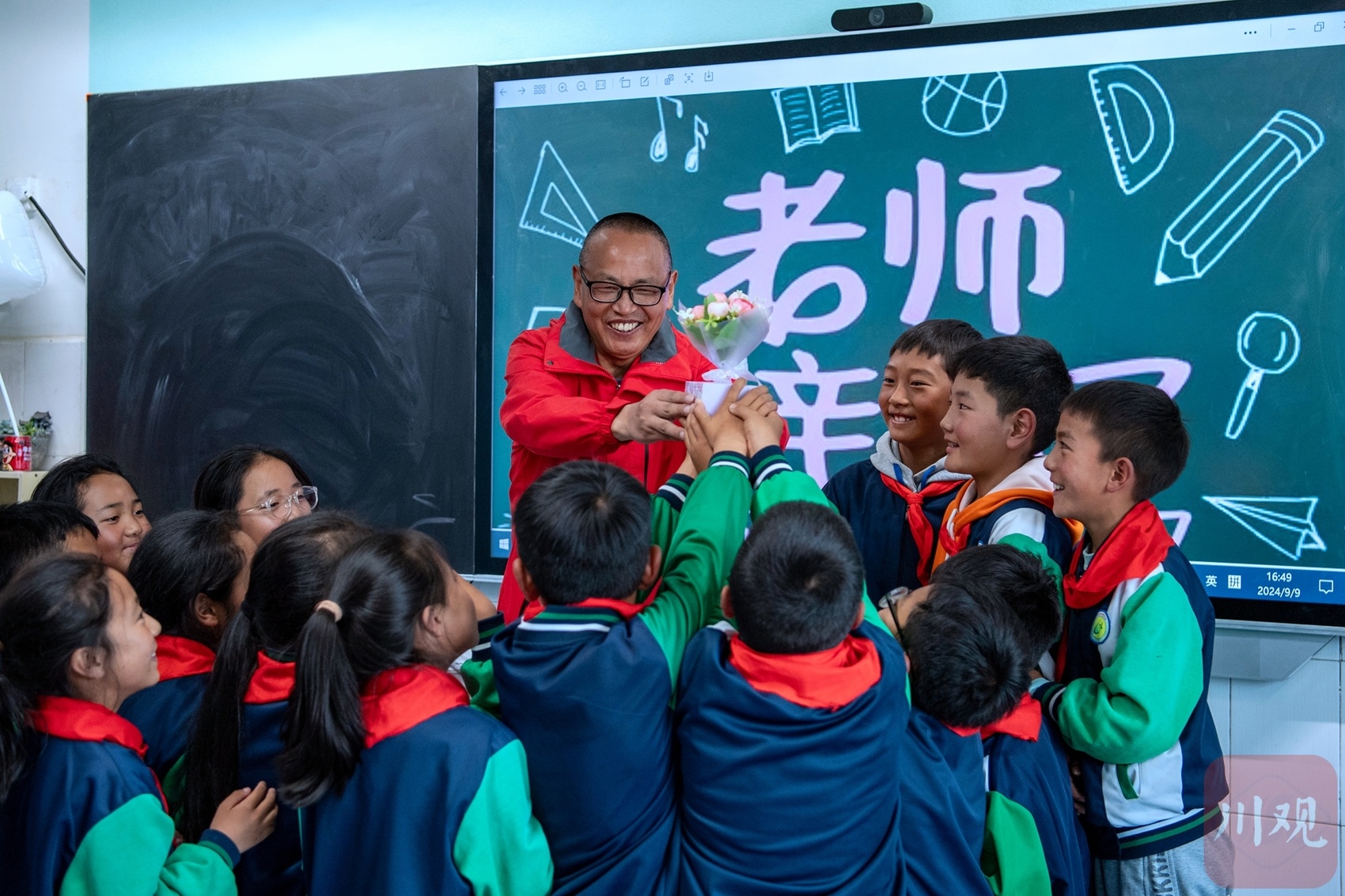 9月10日,2023年到阿坝州红原县城关小学支教的绵阳市盐亭县高渠小学张恩君老师收到了孩子们的教师节祝福。他克服各种困难,为高原孩子带去知识。
