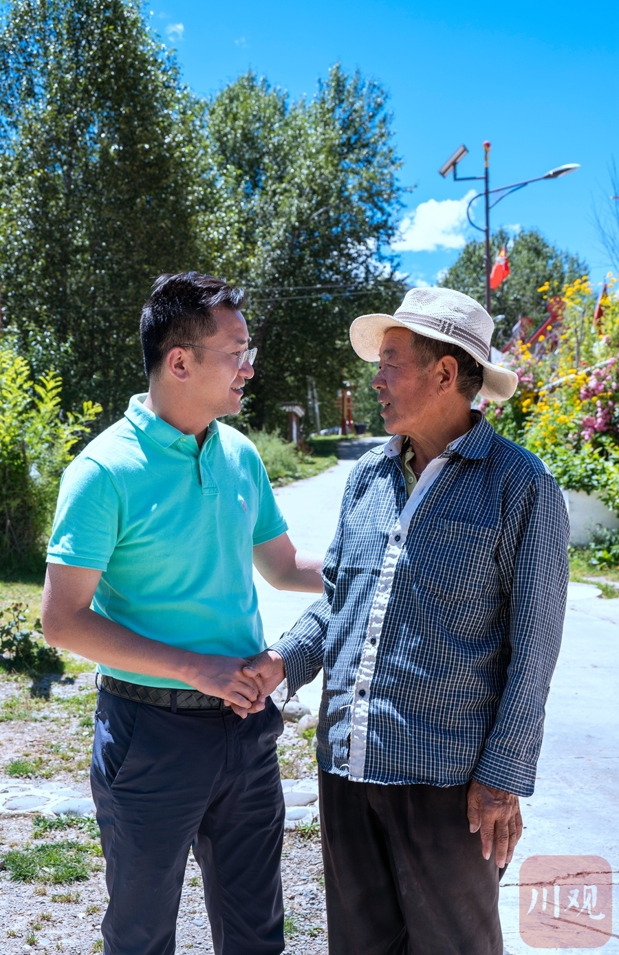 8月21日,甘孜州炉霍县雅德乡交纳村“博士名誉村长”张藜山(左)与村民拉家常。自去年担任“村长”以来,他致力于发展电商和旅游产业,成为乡村振兴的“新引擎”。