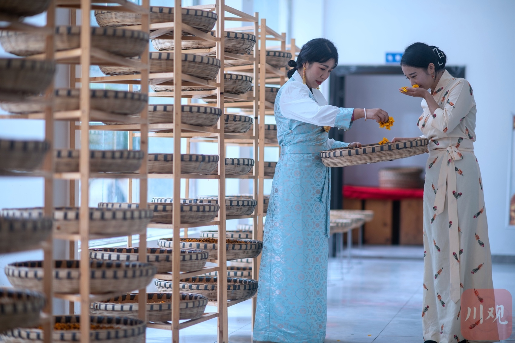 8月17日,阿坝州金川县二嘎里乡二嘎里村,返乡创业青年侯正琴(左)与唐辉在晾晒雪菊。通过直播带货等多种形式,高原雪菊已成为该村的特色产业。