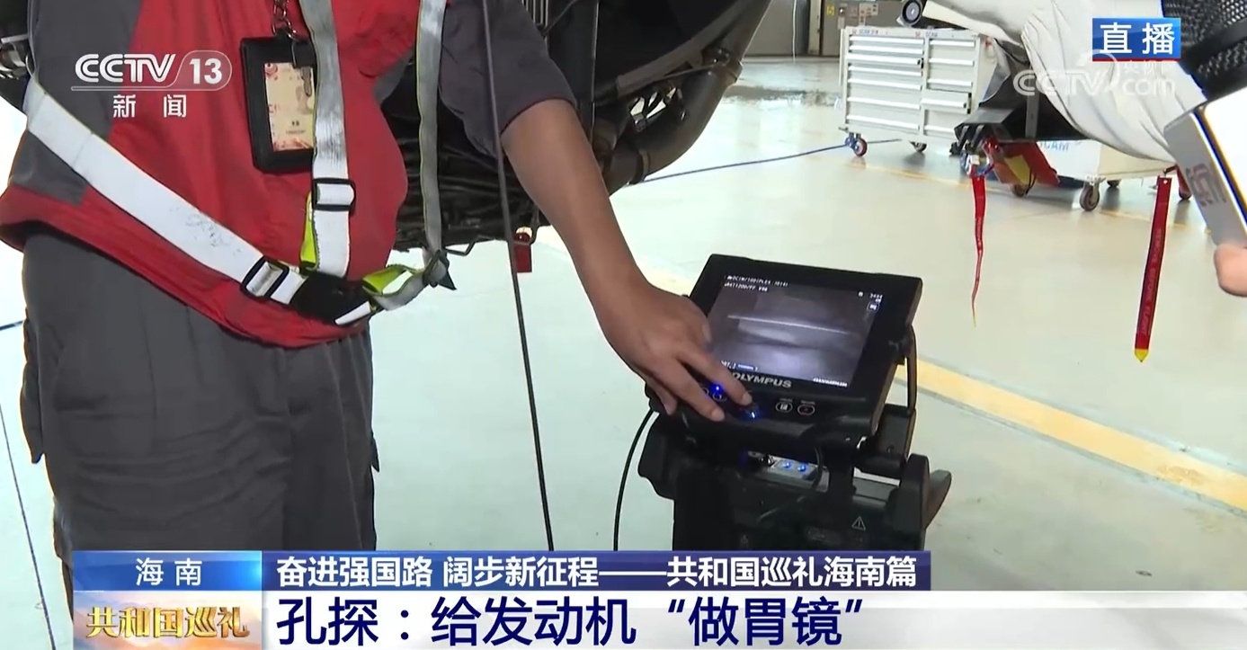 这个就是飞机的核心部件之一——发动机,因为发动机零件较多,内部结构复杂,维修技术人员正在使用专业检测设备对发动机内部进行孔探检查。就是插入这根“工业内窥镜”,通过它前置摄像头反馈在显示屏上的高清实时画面,孔探人员可以清晰地检测发动机的核心部分,准确地判断出可能存在的各种缺陷类型、形状,整个过程好比给发动机做“胃镜检查”。