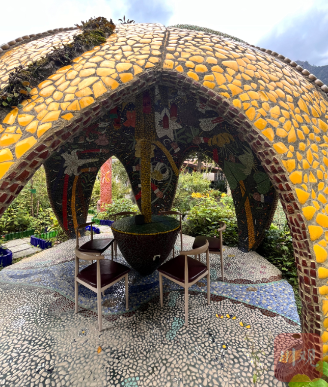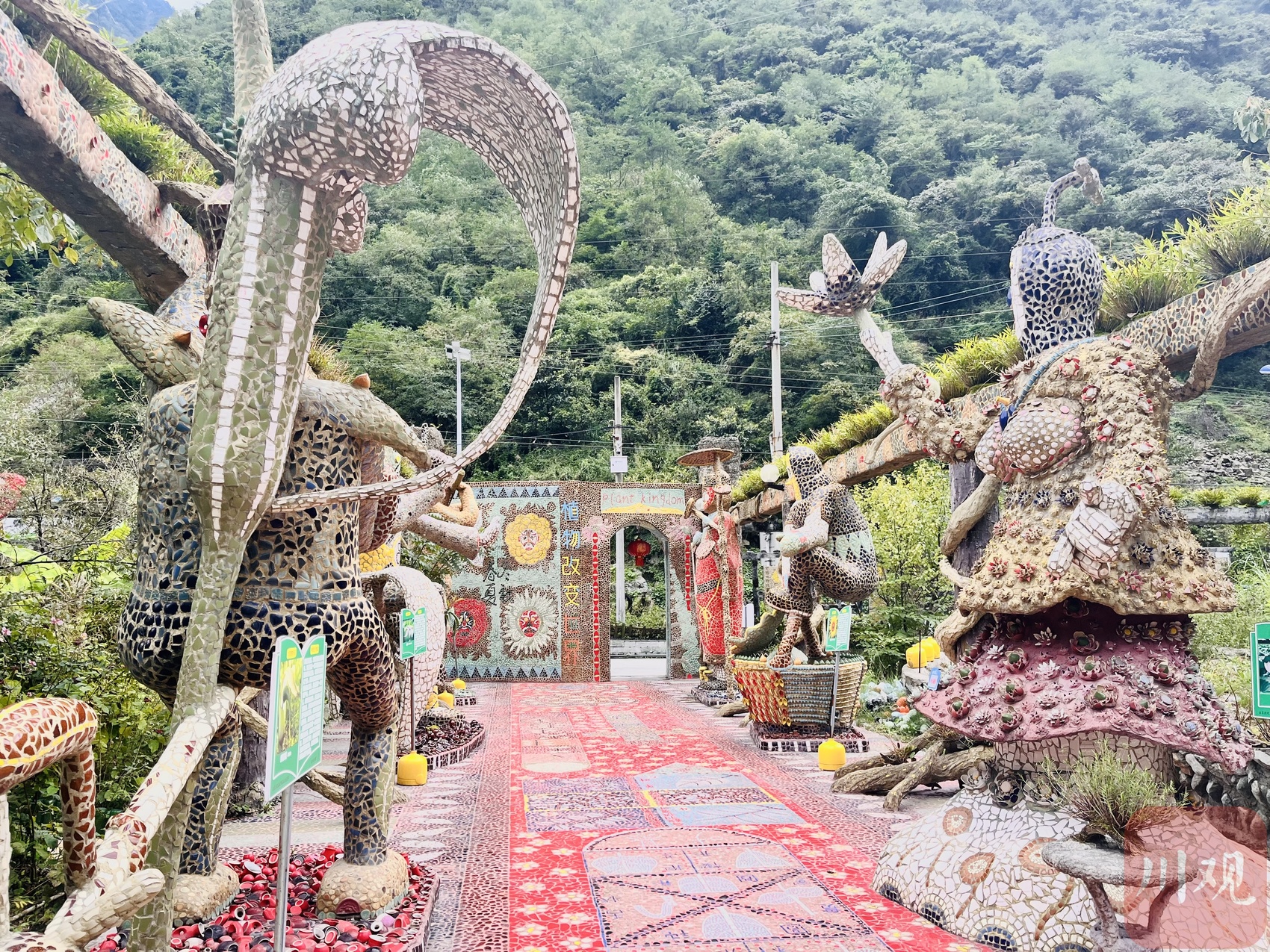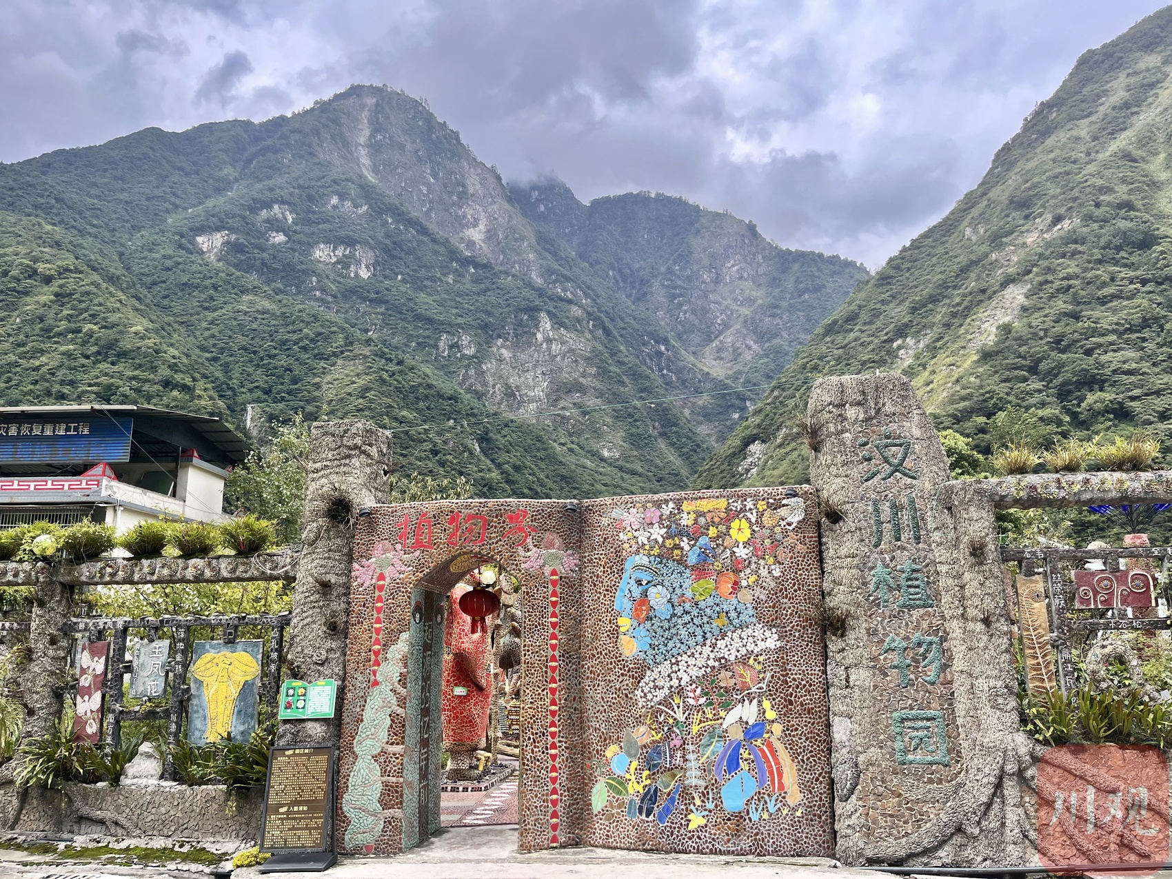 汶川植物园坐落于不太宽阔的213国道旁,石质的外墙上用五颜六色的瓷片拼接出彩色壁画,为这个被群山包围的小村落增添了丰富的色彩。大门做成了书的造型,封顶写着“植物界”,寓意着踏进植物园就如同进入植物的世界。