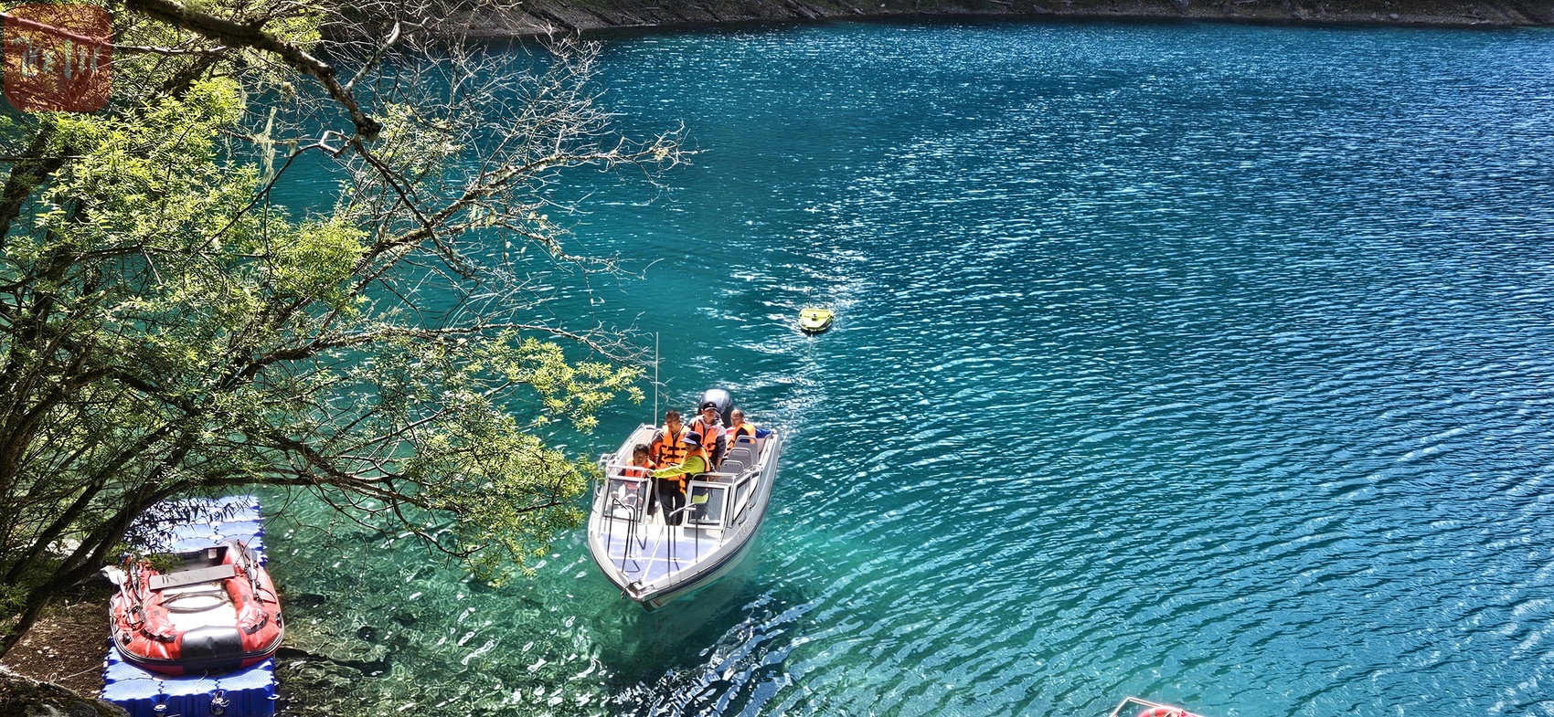 科研团队成员乘巡逻船在九寨沟长海开展测量工作。