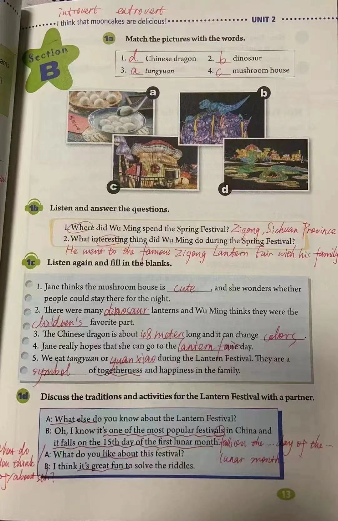其中,九年级U2、 P13,第二单元Section B 1a-1d听力部分把万圣节改成了春节和元宵节。在人物对话中,吴明提到自己和家人春节期间回到故乡四川自贡,去看了鼎鼎大名的自贡灯会,还向朋友展示了灯会的照片。