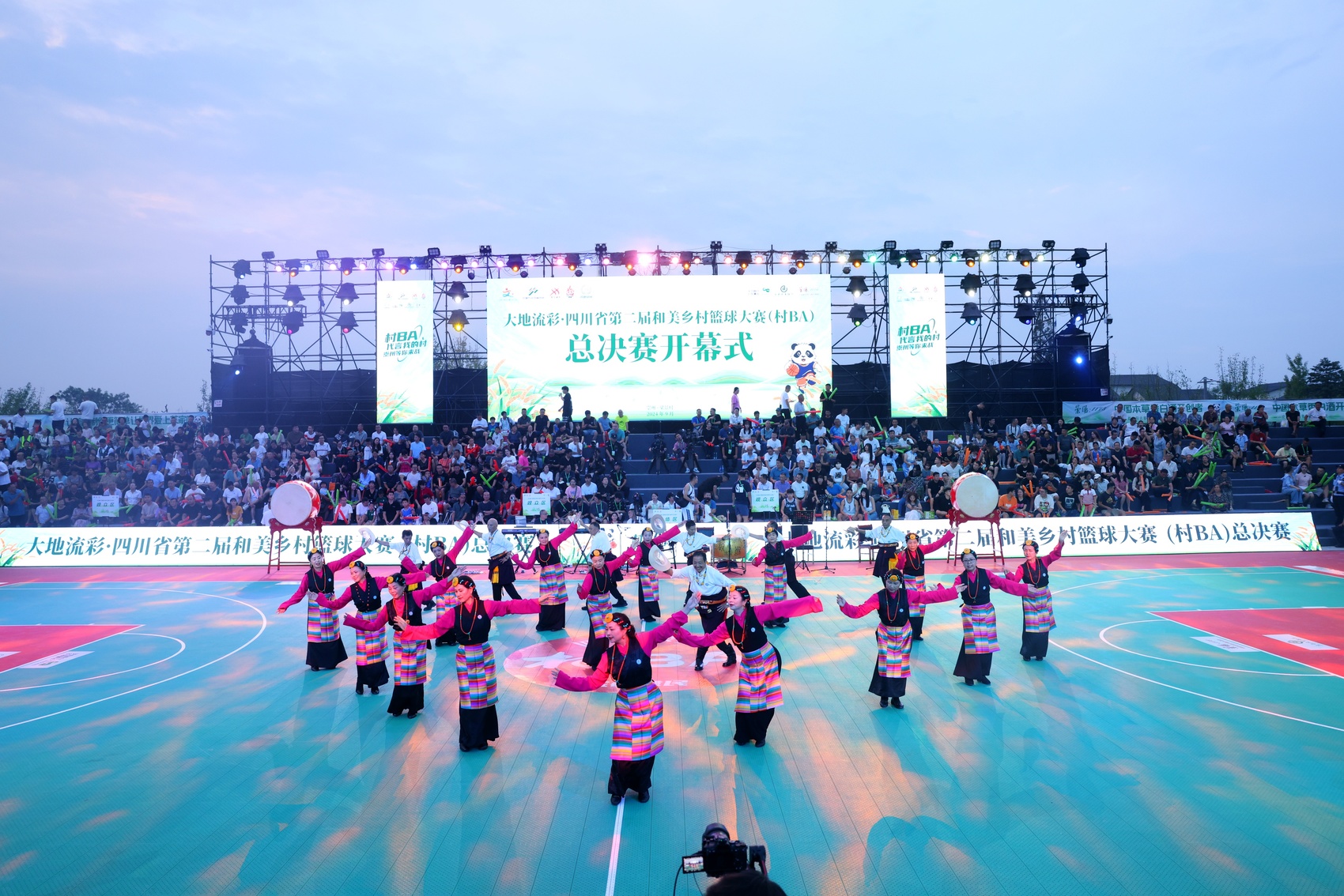 夜幕降临,八方来客汇聚一堂,共同见证大地流彩的辉煌时刻。四川省第二届和美乡村篮球大赛(村BA)总决赛在盛大的光影秀《崇礼迎宾》中拉开序幕。
