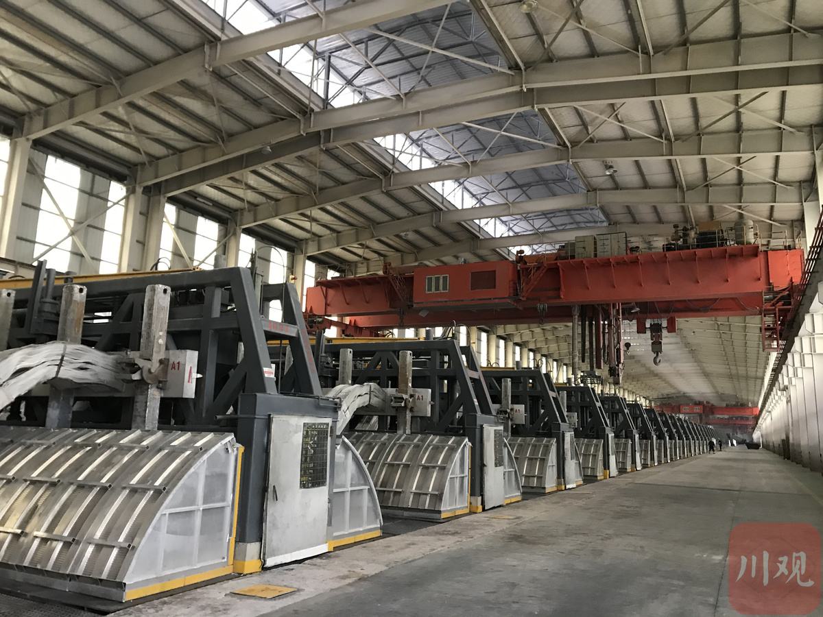跟郭庆峰一起过来的还有900多名员工。在广元中孚一厂生产车间,车间主任冯青山正在对车间内的电解槽进行巡查,这里的234台电解槽一天就能生产700吨左右的铝液。生产出来的铝液直接运往车间旁的铝材加工车间,也直接提供给园区的铝产业加工企业,省去了重熔过程,可直接进行加工。