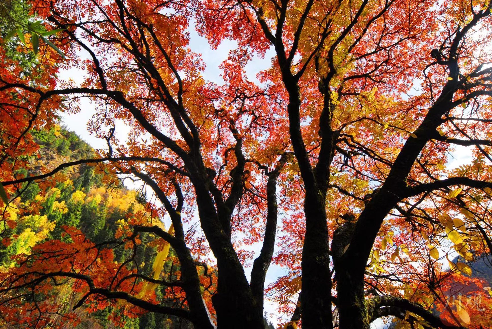 当然,最壮观的当属在亚洲名列前茅的奶子沟彩林区。这里的山梁郁郁葱葱,原始森林中的各种色彩层层铺开、错落有致,自然抒发着快乐。绯红、紫苏、流金、粉银等各种色彩汇聚,红里透着褐,蓝中镶着黄,清纱如蝉翼般包裹着这满目的色彩,相互辉映、相得益彰,宛如大自然捧出的丰厚礼物。