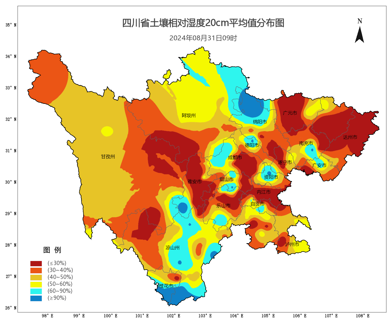 2024年8月31日四川省土壤相对湿度20厘米平均值分布图。四川省农业气象中心提供