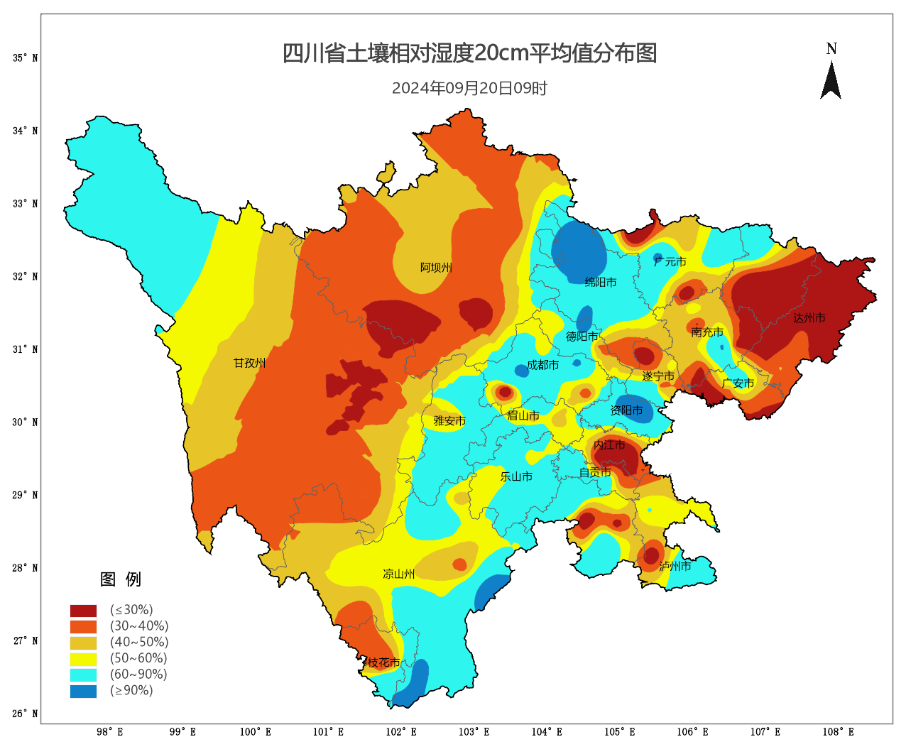2024年9月20日四川省土壤相对湿度20厘米平均值分布图。 四川省农业气象中心提供
