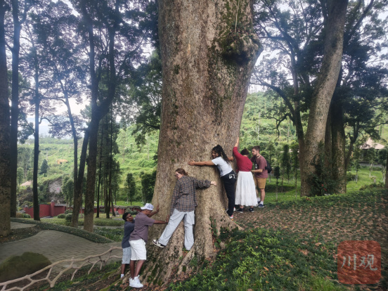 在位于雅安市荥经县的中国·荥经桢楠王公园内,200多棵古树静静伫立。其中最古老的“桢楠王”,高达30米,树龄约1700年,犹如一位智慧的长者,守护着这片土地的宁静。听闻约8个成年人才能环抱它,外国友人们立刻“组队”体验,“这是我第二次来到这里,但再次看到并环绕它,依然觉得震撼!”来自乌克兰的老柴说。